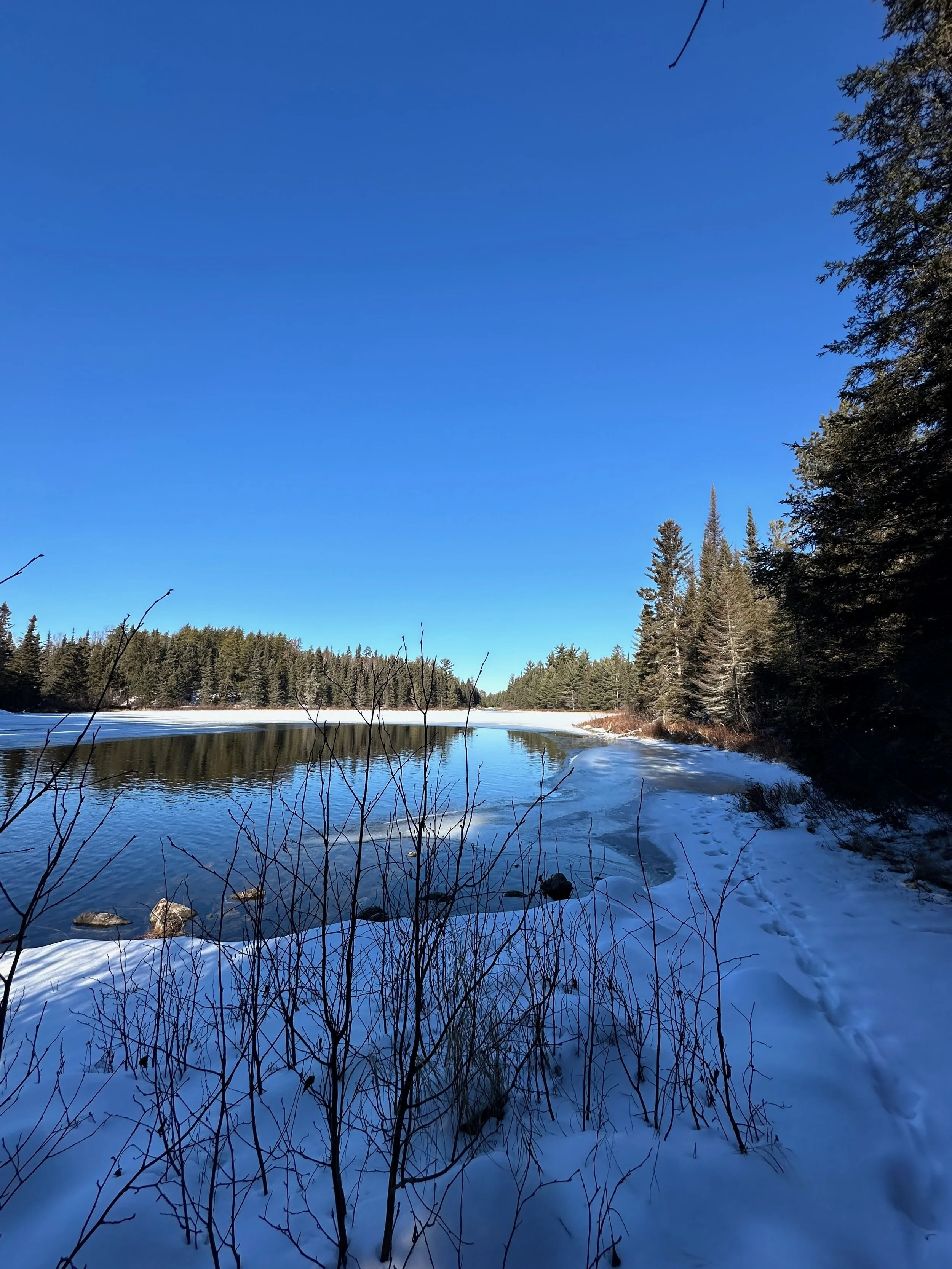 QUETICO PROVINCIAL PARK – Punching through a few inches of snow, I paused at the end of the portage trail. As far as I could see was open water. Snow and ice skirted the edges near where we stood. Due to the thick brush and a narrow shoreline, it was impossible to scout safely. The small river disappeared around a bend. The choice was clear. We needed to change our route.