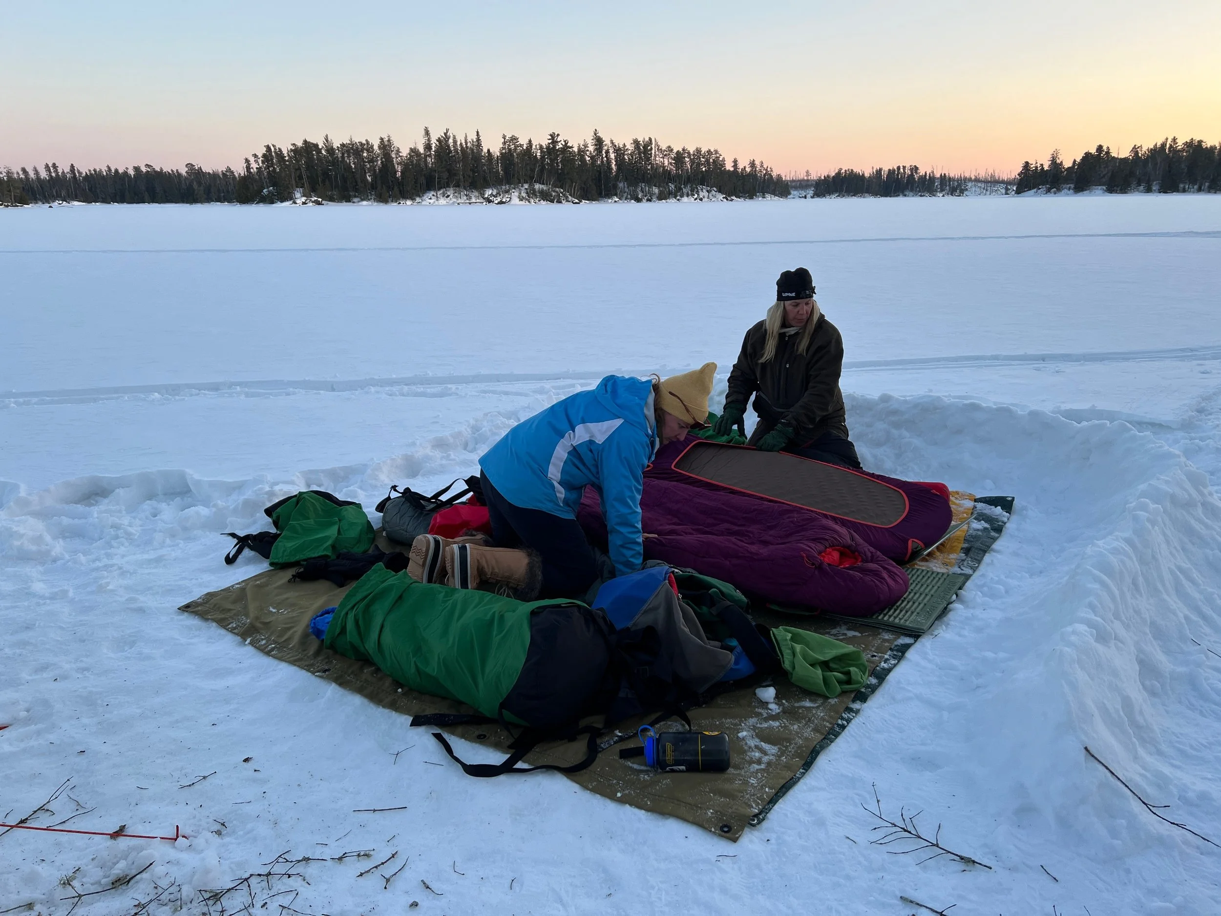 Preparing to sleep on the ice during mild weather. Temps went down to 15º at night with a 5 mph breeze. We were in a protected bay out of the wind, however we built a wind wall (seen on the right) in case it kicked up. Sleeping bags were rated to -20º and included outer bags.