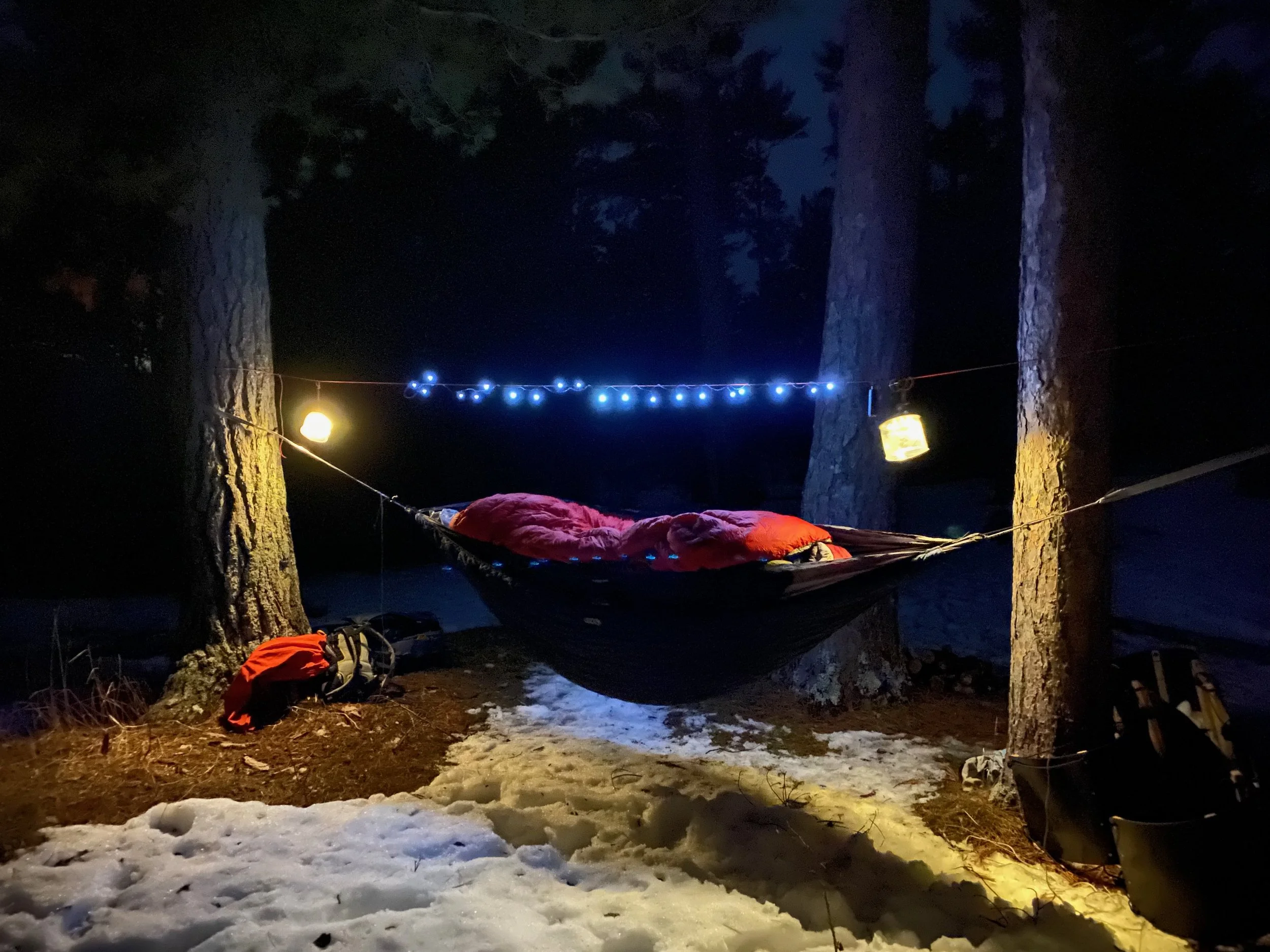 When I guide winter trips, I sleep outside, usually in a hammock as I find it most comfortable and warm. But I’ve had a few experiences sleeping out on the ice and that can be fun too–especially when the stars are out. Usually, it’s warmer to sleep higher up, on land, and back in the woods where you’re protected from the elements. Sometimes the nights are mild though, and we’re drawn out onto the ice.