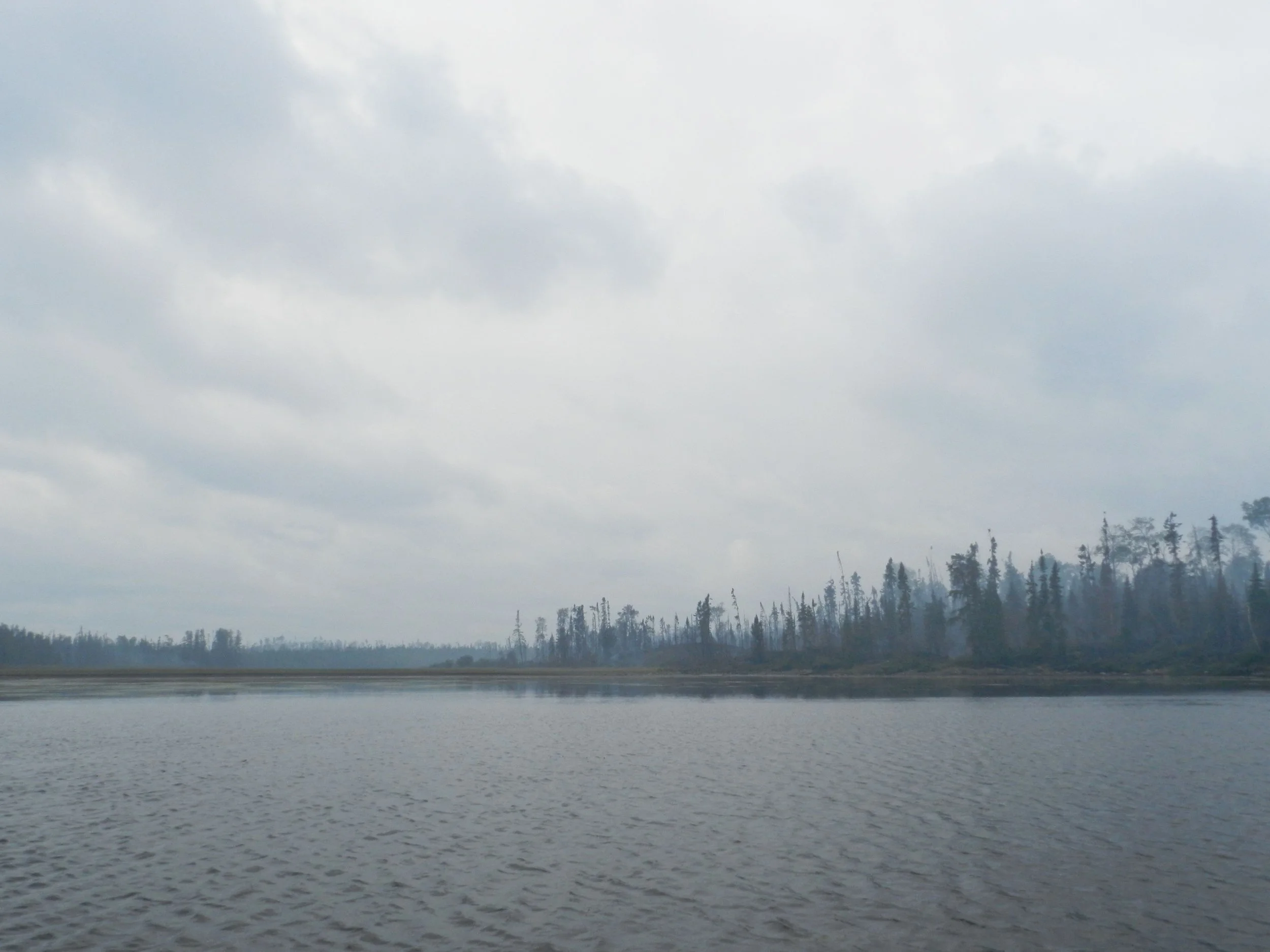 Whitewater Lake. Never mind the morning chill – the resplendent sunrise more than makes up for it. Taking advantage of the calm to enjoy the view, we make our way south again. Whitewater Lake being a giant, upside-down “U,” we’re at the curve’s apex, now making our way down the right side. And back into the smoke and the big waters.